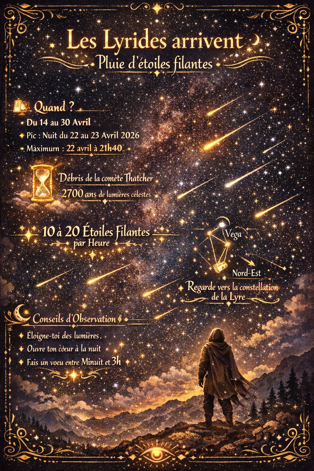 Les Lyrides ne sont pas seulement un phénomène astronomique : elles sont un appel intérieur. Elles rappellent que tout ce qui chute peut devenir lumière, que chaque transformation porte une renaissance. Observer les Lyrides, c’est se relier à la fois à l’immensité du cosmos et à la profondeur de son propre être.